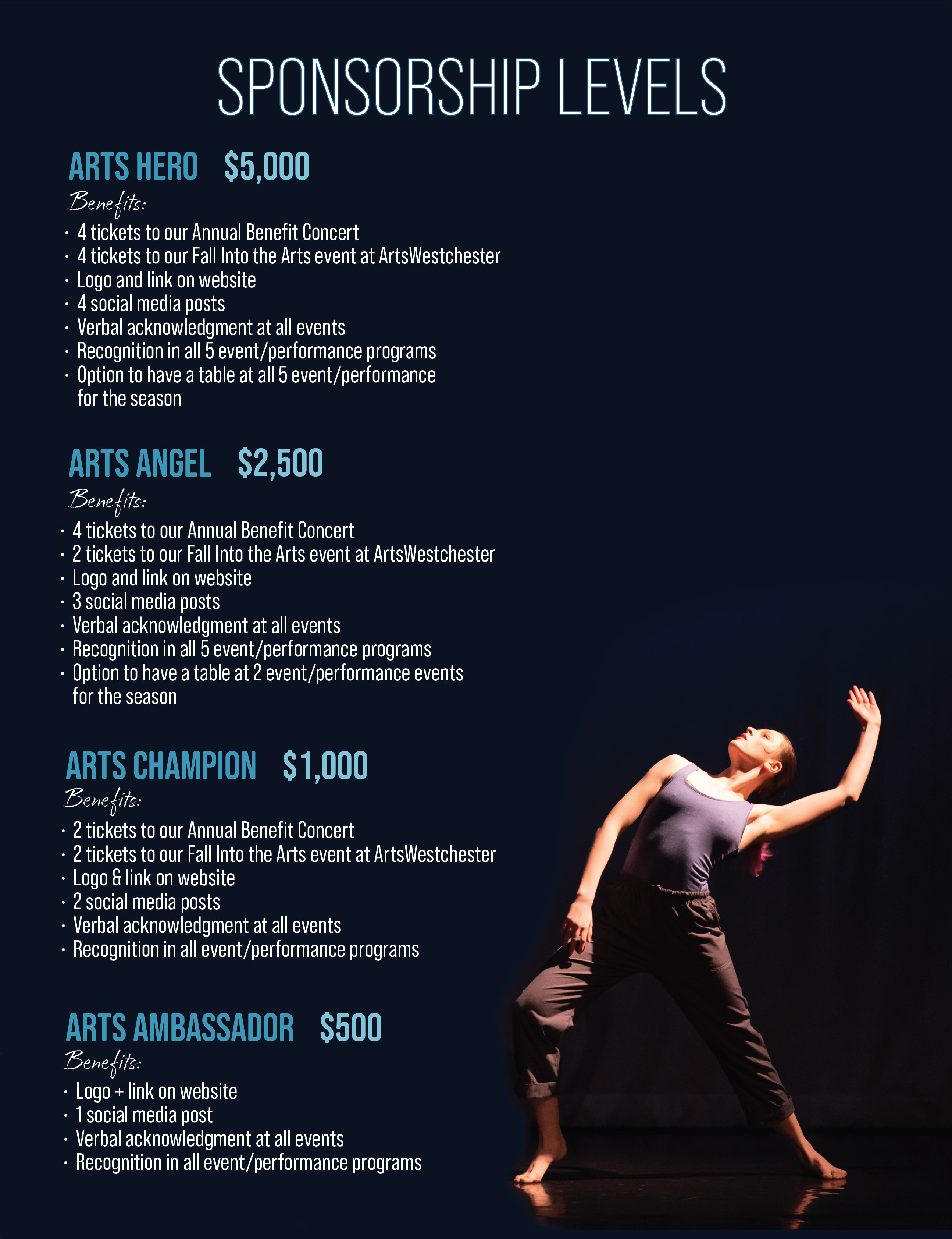 Corporate sponsorship is essential to Steffi Nossen Dance Foundation’s mission to provide accessible dance education and strong advocacy for the arts throughout Westchester County without boundaries or borders. Corporate support helps us remove financial barriers, expand programming, and ensure that dance remains an inclusive and impactful resource for learning, expression, and community connection for all.